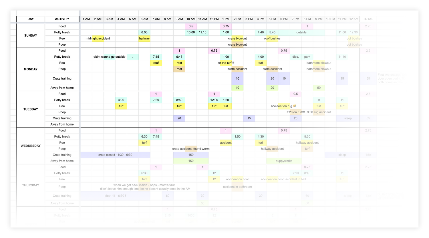 - The Food + potty log is helpful in the first weeks of potty and crate training.