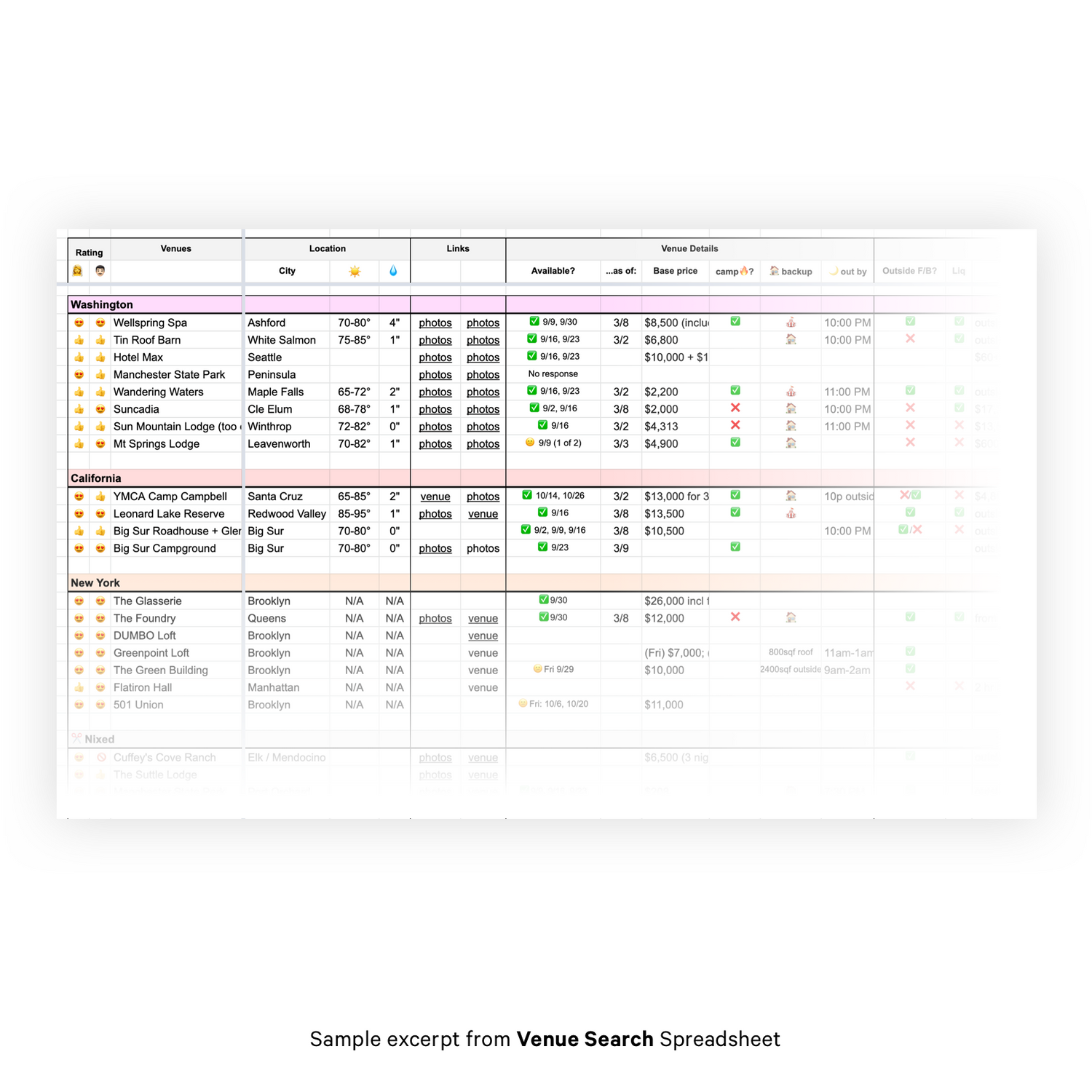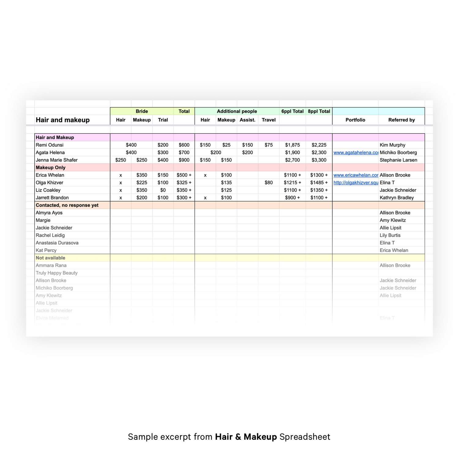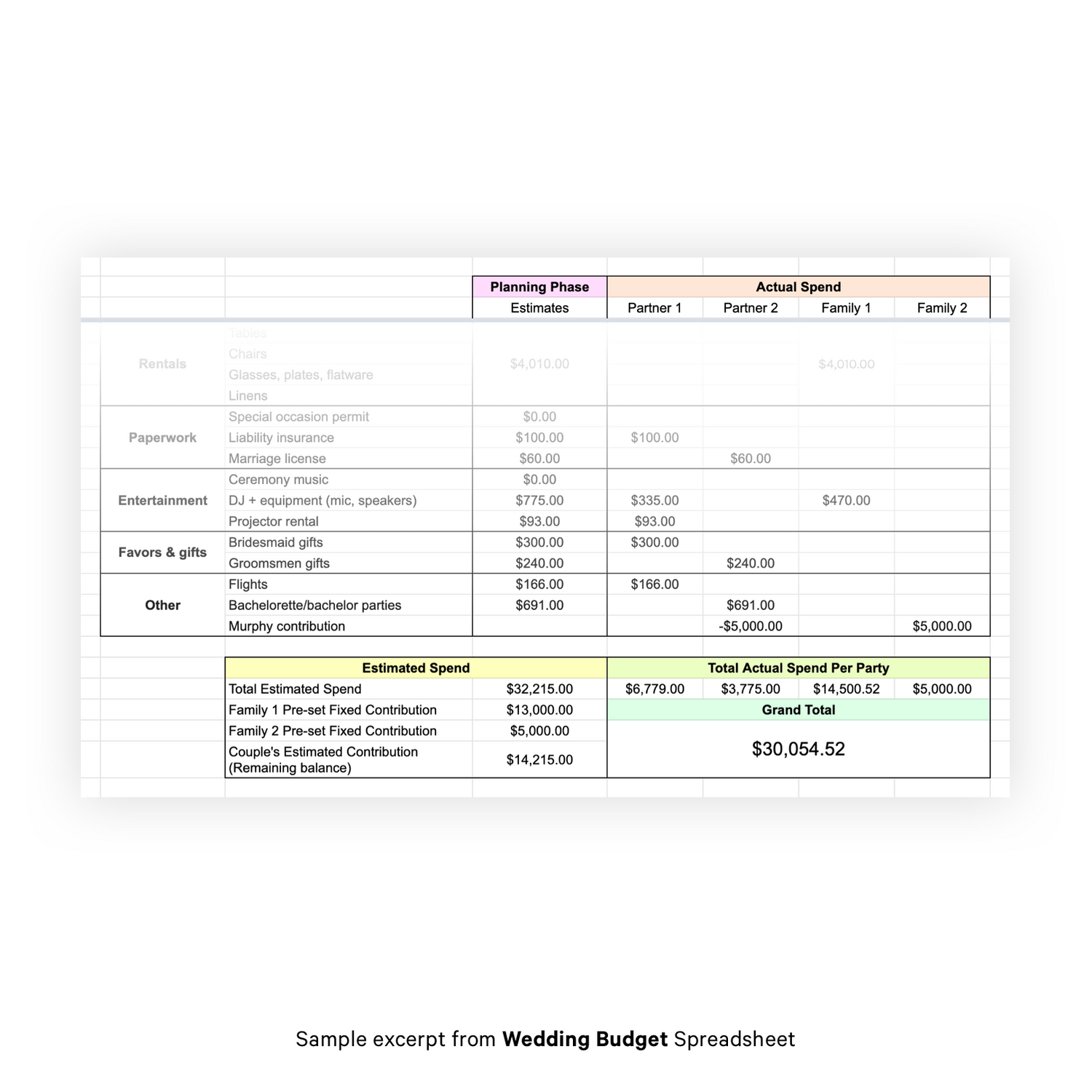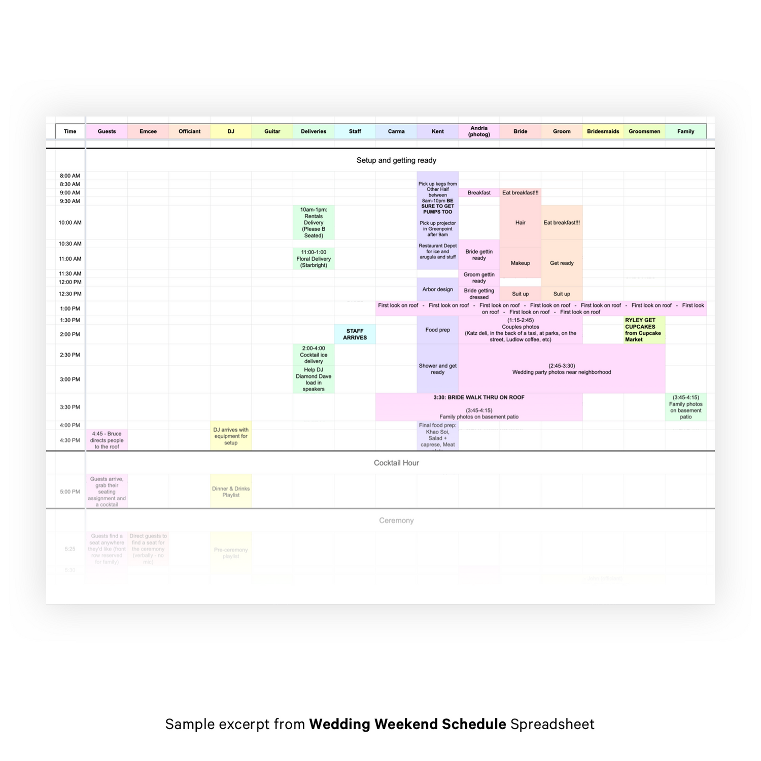 Planning a wedding is a lot of work! And the stakes are high; you want your big day to be perfect. When I planned my wedding, I was surprised by how much work it took, and keeping the details organized was a big part of that. So I stepped back and organized the work, and as information came in, or as we had to make decisions, we referenced the tools I had made. Since, 1000 other couples have used these spreadsheets to plan their big day.